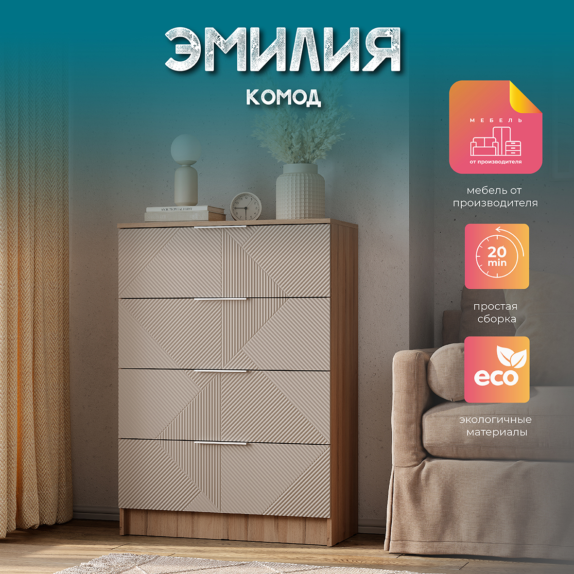 Комод "Эмилия" КМ-02 обладает четырьмя просторными ящиками для одежды и белья. Благодаря эргономичным фасадам открывание ящиков становится удобным и лёгким.