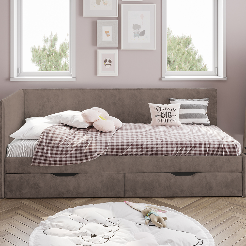 Кровать «Лео» - лучший выбор для детской комнаты. Плавные и лаконичные линии конструкции создадут атмосферу гармонии и спокойствия. Одно из важных преимуществ кровати – это мягкая обивка из велюра, что обеспечивает более комфортное и безопасное использование. Корпус – ЛДСП/ДСП 16 мм, оклеенный поролоном 20 мм и тканью велюр. Фасад – ЛДСП 16 мм, оклеенный поролоном 20 мм и тканью велюр. Ткань велюр с эффектом хамелеона, не оставляет следов. Этот эффект достигается за счет специальной обработки материала, который содержит глянцевые частицы, отражающие свет под разными углами.