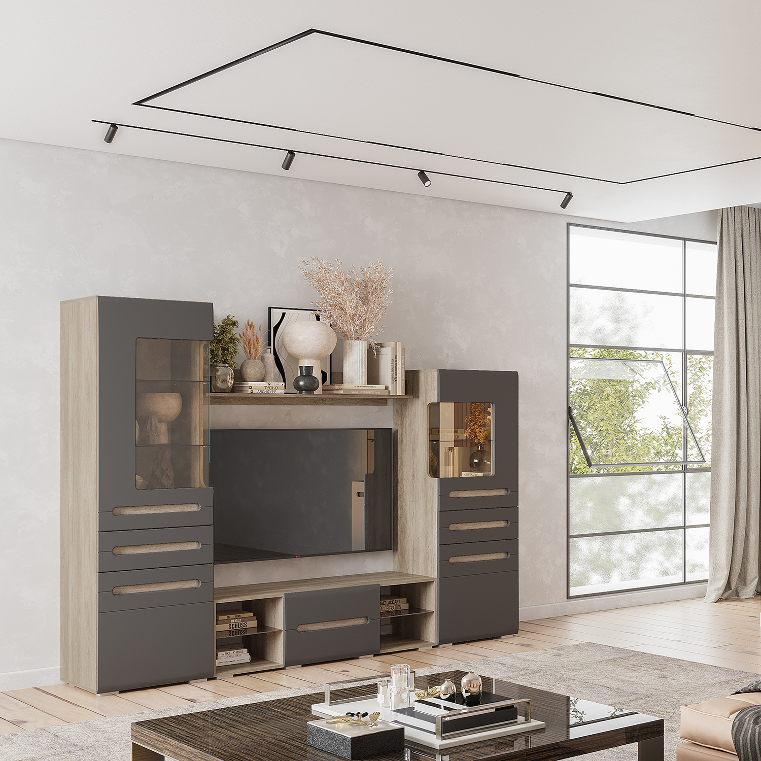 Модульная коллекция «Наоми» – это стильное современное решение в контрастном сочетании корпуса «дуб каньон» с элегантным матовым фасадом насыщенного грифельного оттенка. Оригинальное конструктивное решение коллекции – ручки фасадов, выполненные путем сложной фрезеровки с максимально реалистичным декором дубового спила.