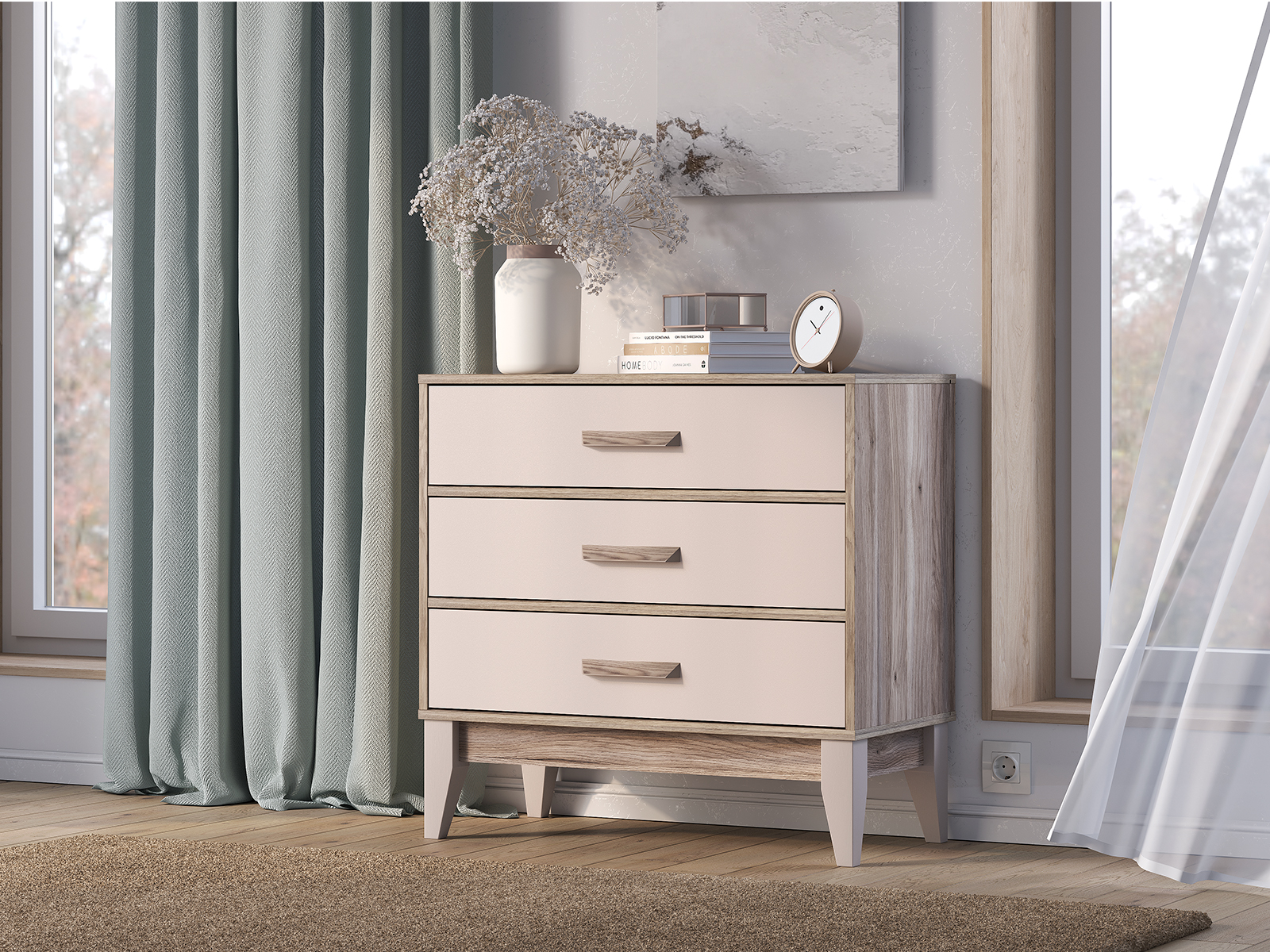 Комод "Скандика" КМ-01 с тремя ящиками подойдет и для спальни, и для гостиной, и для детской. В ящиках с удобными геометрическими ручками можно хранить постельное и одежду.