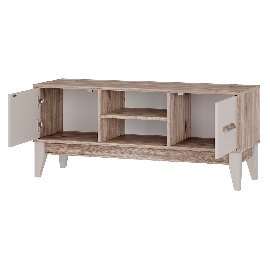 Многофункциональная тумба под ТВ «Скандика» — универсальная модель для современной гостиной, которую отличает минималистичный дизайн и оптимальное сочетание открытых и закрытых зон хранения. Две вместительных полки за дверцами и две открытых полки позволят разместить всю нужную технику.